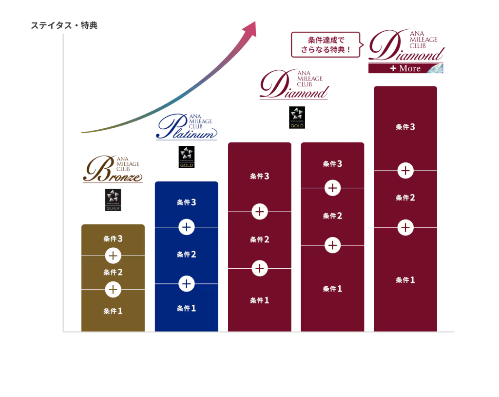 ANA公式が示す条件(ブロンズ/プラチナ/ダイヤモンド等)は以下の通りです。