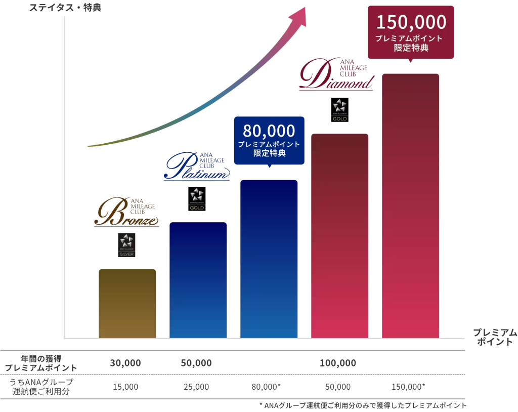 | ステイタス | 年間プレミアムポイント(PP) | うちANAグループ運航便ご利用分 |